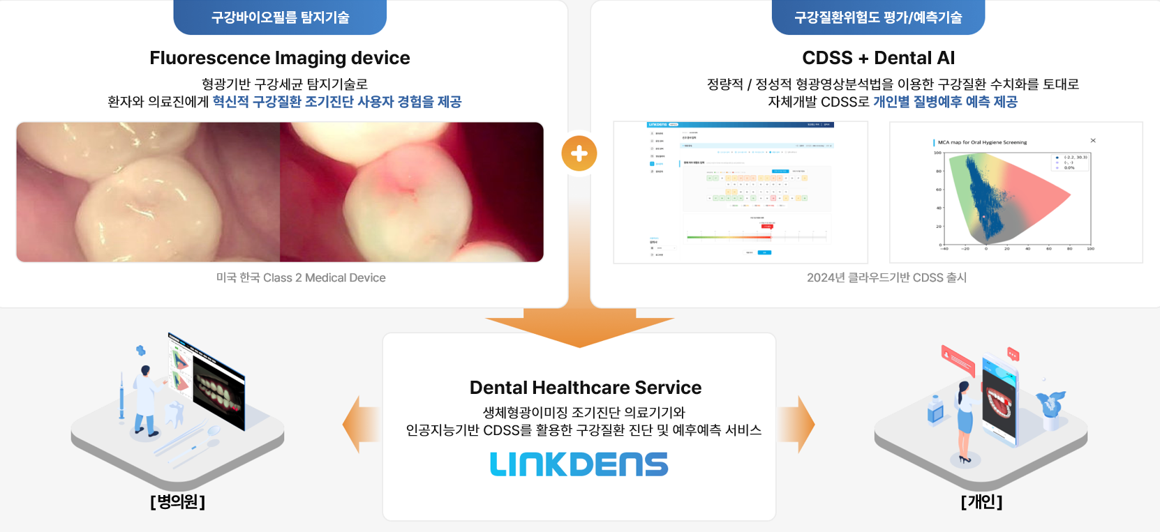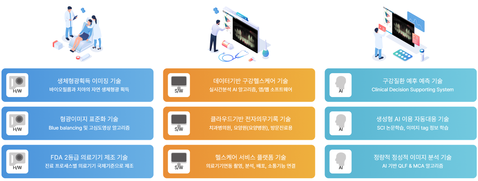 • 자체 형광영상 의료AI 기술로 정량분석 및 임상결정지원시스템(CDSS) 을 통합하여, 예방진료 - 정밀진단 - 자가관리까지 연결되는 객관적 데이터 기반 구강헬스케어를 제공합니다.
