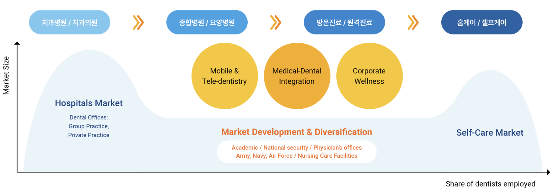 전세계 치과 비지니스 분야별 성장 전망치를 분석했을 때 고령인구관련 시장, 치과비대면진료 분야 그리고 구강건강검진 시장이 크게 성장할 분야 입니다. 전세계 치과비대면진료 시장은 2022년 1,513.8백만 달러 -> 2027년 3,347.6백만 달러로 연평균 17.2% 씩 성장할 전망이고, 북미는 2022년 가장 큰 지역으로 전체의 39.1%를 차지해 5억 9,140만 달러의 가치, 2022년~2027년 연평균 15.5% 씩 성장할 전망입니다. (출처: Teledentistry Global Market Report 2023, The Business Research Company)