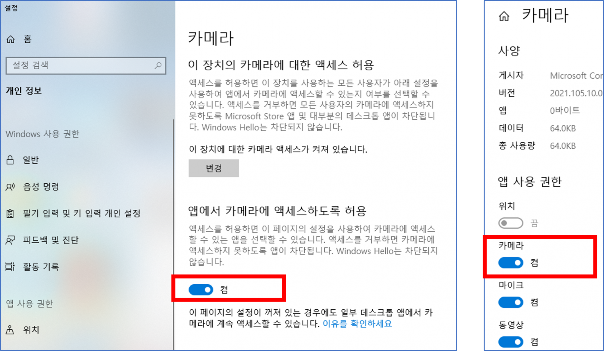 윈도우 카메라 관련 설정에서 켬으로 선택합니다.